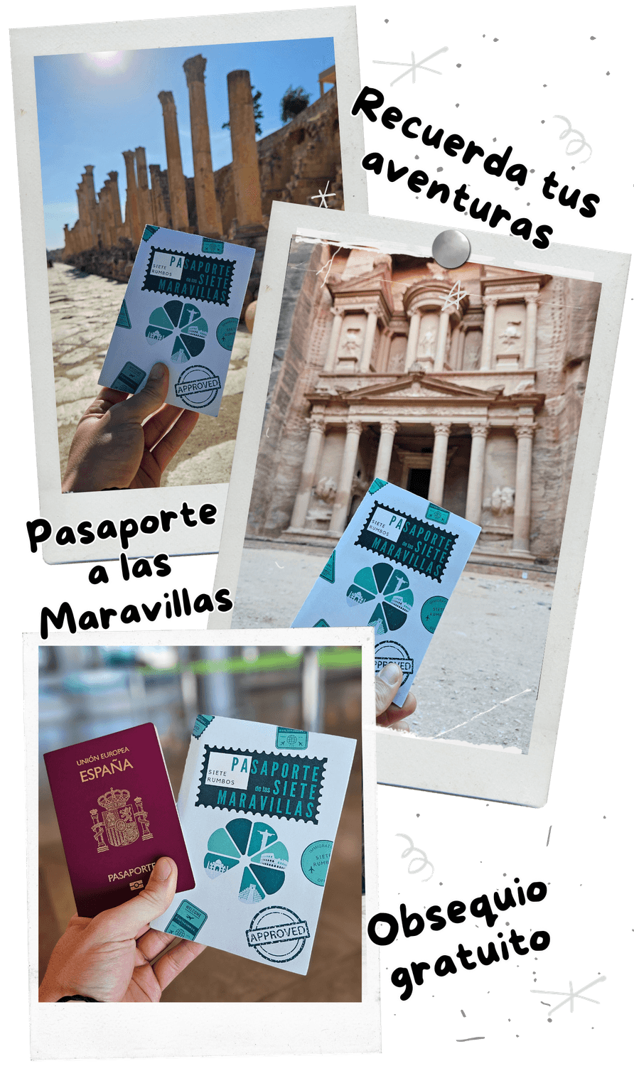 Es un pasaporte simbólico diseñado especialmente para ti, donde podrás sellar cada una de las Maravillas del Mundo que visites. Tendrás espacio para anotar tus reflexiones, pegar fotos y marcar cada destino como "completado".